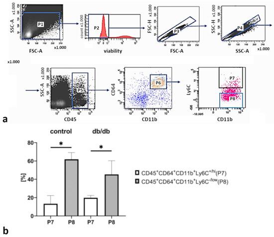 Sorting strategy (a) and macrophage subpopulations count in db/db and control mice (b). Gates: P1—whole cell count after enzymatic digestion of cardiac tissue; P2—viable cells; P3 and P4—doublet exclusion; P5—CD45+; P6—CD45+CD11b+CD64+. Finally, two populations were gated: P7—CD45+CD63+CD11b+Ly6C+/hi and P8—CD45+CD63+CD11b+Ly6C+/low. Values are mean ± S.E. (n = 6); *, p < 0.05 versus control group as determined by Wilcoxon signed-rank test.