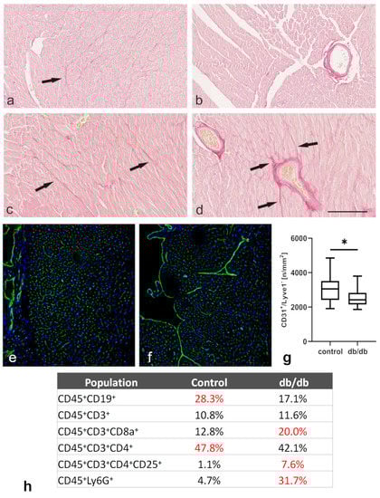 (a–d) Paraffin sections of control and db/db mouse hearts stained with Picrosirius red demonstrate collagen deposits. (a,b)—representative sections from control hearts with a slight interstitial and perivascular fibrosis stained in dark red; (c,d)—representative sections from db/db mice demonstrating a slight increase in interstitial and perivascular fibrosis, marked with arrows; scale bar—100 μm. (e–g) Density of CD31+Lyve-1− cells in the left ventricular wall of control and db/db mice. (e,f) selected cryosections of control and db/db mouse hearts stained with anti-CD31 (green) and anti-Lyve-1 (red) antibodies, analyzed under a confocal microscope. (g) CD31+Lyve-1− cell count per 1 mm2 in the left ventricular wall of control and db/db mouse hearts; * p < 0.05 versus control group as determined by Wilcoxon signed-rank test. (h) Flow cytometry analysis of leukocyte subpopulations in cell suspensions obtained from control and db/db mouse cardiac tissue. Table shows percentages of leukocyte subpopulations in total leukocyte population.