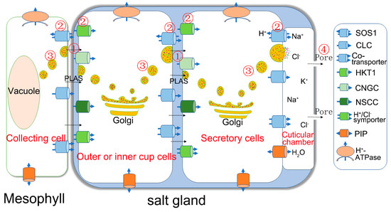 Simplified illustration of salt secretion from plant salt glands. Na+ is transported into the salt gland from the collecting cell, which covers the salt gland, and consists of a huge vacuole and a shrinking cytoplasm, through the plasmodesmata (pathway 1), membrane-bound transporters (pathway 2) such as SOS1 in the transfusion zone, or via vesicular transport (pathway 3). In the salt gland (blue), the ions can be directly transported into the intercellular space of the outer or inner cup cells and the secretory cells via the different pathways (①, ②, ③). The ions are parceled into vesicles for transport from the cytosol to the plasma membrane, then secreted out of the salt gland cells via pathways ② and ③. The ions are eventually forced out of the secretory pores ④ at the top of the salt gland as result of the high hydrostatic pressure. Ion transporters in charge of influx (green) and efflux (blue) are asymmetrically distributed in the plasma membrane of salt gland cells. PLAS, plasmodesmata; HKT1, high-affinity K+ transporter 1; CNGC, cyclic nucleotide-gated cation channel; NSCC, non-selective cationic channel; PIP, plasma membrane intrinsic protein; NHX, Na+/H+ antiporter; SOS1, Na+/H+ antiporter; CLC, chloride channel.