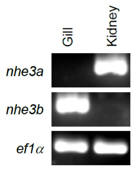 Reverse transcription PCR (3 min denaturation at 95 °C; and 35 cycles of 95 °C for 30 s, and 30 s at 56 °C (nhe3a, nhe3b, ef1α), and 72 °C for 1 min, final elongation at 72 °C for 5 min) was performed on RNA extracted from tissues (gill and kidney) of three adult O. mykiss and visualized by electrophoresis on a 2% agarose gel stained with ethidium bromide and imaged using AlphaImager 2200 (ProteinSimple, San Jose, CA, USA). The identities of all PCR products were confirmed by sequencing.