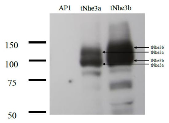 Western blot analysis of expression tNhe3 proteins. Western blot of whole cell lysates of stable cell lines expressing tNhe3a or tNhe3b proteins. Moreover, 100 μg of total protein was loaded in each lane. The sample was immunoblotted with anti-GFP tag antibody. AP-1 is a cell lysate from mock transfected AP-1 cells.