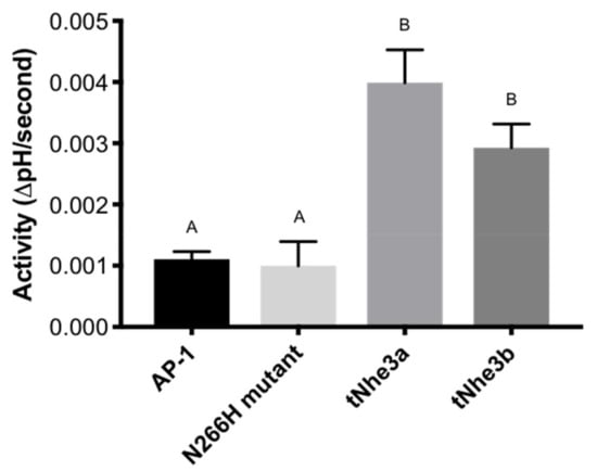Summary of activity of tNhe3 proteins in stably transfected AP-1 cells. Activity was measured after ammonium chloride pre-pulse as described in the “Materials and Methods”. Results are ∆ intracellular pH/s. Data are presented mean ± SE, while dissimilar letters indicate statistical significance between groups as demonstrated by one-way ANOVA, with Tukey’s multiple comparisons test (n ≥ 6, p < 0.05, ANOVA).