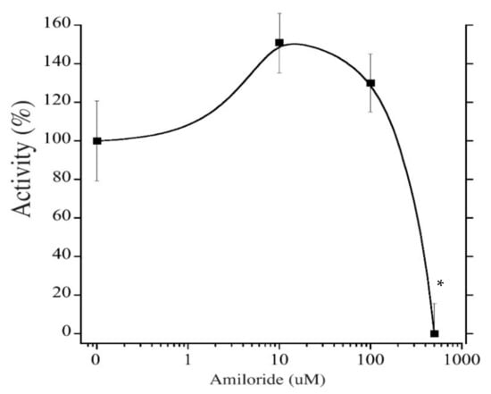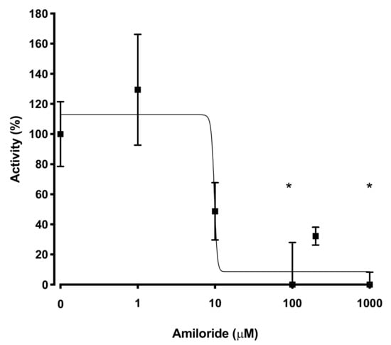 Effect of Amiloride on tNhe3b activity. The cells were subjected to a two pulse Na+/H+ exchanger activity assay and measured as described in Figure 5. A control was in the presence of equal amounts of vehicle (DMSO). Asterisk * indicates significantly different from the control at p < 0.05, one-way ANOVA, with Tukey’s multiple comparison’s test. IC50 relatively incalculable, but approximately 335 µM. Each experimental point is mean +/− SE of 7–11 measurements, control n = 17.