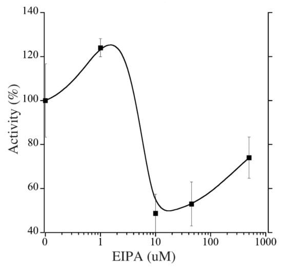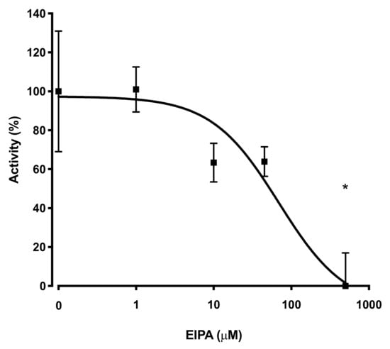 Effect of varying concentrations of EIPA on activity of tNhe3a. tNhe3a containing cells were subjected to a two pulse Na+/H+ exchanger activity assay and measured as described in Figure 5. EIPA concentrations were from 1 to 500 µM. IC50 estimated at 44 µM. Raw data presented in Figure S3. Asterisk * indicates significantly different from the control at p < 0.05, one-way ANOVA, with Tukey’s multiple comparison’s test. Data are presented as mean +/− SE and each experimental point is 8–10 measurements, control n = 18.