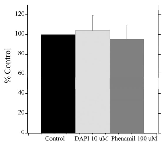 Effect of phenamil, or DAPI on tNhe3b activity. The cells were subjected to a two pulse Na+/H+ exchanger activity assay and measured as described in Figure 5. The control treatment was in the presence of equal amounts of vehicle (DMSO). Na+/H+ exchanger activity presented as % of control AP1 cells. Asterisk * indicates significance from the control as demonstrated by one-way ANOVA at p < 0.05. Results are mean +/− SE of at least eight independent experiments.