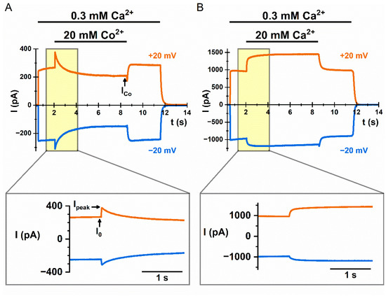 We have previously shown that intracellular Co2+ (up to 20 mM) by itself does not activate current in WT16A. However, intracellular Co2+ potentiates the Ca2+-induced WT16A current, followed by an inhibition effect [38]. Co2+ inhibition on the WT16A current (see Figure 1A) is easier to understand—Co2+ competes with intracellular Ca2+ for the high-affinity Ca2+-activation sites [38]. The current potentiation by Co2+, however, is a different mechanism because the potentiation occurs before the inhibition. A high [Ca2+]i also potentiates the current of WT16A (Figure 1B), just like the potentiation generated by high [Co2+]i. For both Co2+ and Ca2+, at least hundreds of µM are required for generating a detectable potentiation effect. As the potentiation appears almost immediately upon the application of Co2+ or Ca2+, the effect likely results from a potentiation of Cl- conduction through the TMEM16A pore [38].