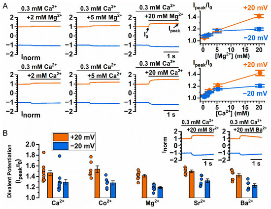 To further explore the mechanism underlying Co2+ and Ca2+ potentiation, we examined whether other divalent cations also potentiate TMEM16A current. Figure 2A compares the dose-dependent potentiation of Mg2+ (upper panels) and Ca2+ (lower panels) on the WT16A current. In these experiments, the current was induced by 300 µM [Ca2+]i at +20 mV (colored in orange) and −20 mV (colored in blue), followed by the application of the indicated concentrations of extra divalent cations (2 mM to 20 mM). To compare the potentiation effects among different experiments, all currents were normalized to the control current (I0) right before the addition of the potentiating divalent cations. The degree of current potentiation, Ipeak/I0, was calculated, and was plotted against the concentration of the potentiating agents (Mg2+ or Ca2+). As shown in the right panels of Figure 2A, the current potentiation by Mg2+ and Ca2+ was qualitatively similar, both in the concentration range required for generating the effect, as well as in the degree of the potentiation. Figure 2B depicts the degree of potentiation of each individual patch (circle symbols) and the averaged potentiation (columns) by various divalent cations at 20 mM. The results show that alkaline earth divalent cations all potentiate the current of WT16A to a roughly similar degree. An approximate 40%–60% increase at +20 mV and a 20%–40% increase at −20 mV of the control current (activated by 0.3 mM [Ca2+]i) can be further induced by 20 mM divalent cations.
