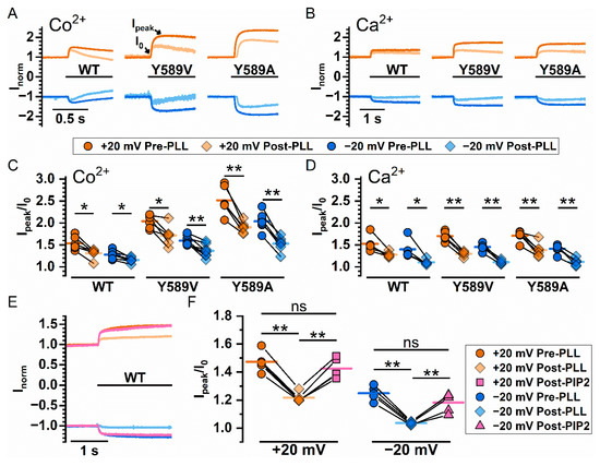 Manipulating Co2+ and Ca2+ potentiation of WT16A, Y589V16A, and Y589A16A by intracellular reagents that affect membrane phospholipids. (A,B) Representative recordings showing Co2+ and Ca2+ potentiation, respectively, before and after treating the patch with poly-l-lysine (PLL, 0.3 mg/mL) for 5 sec. All currents were induced by 0.3 mM [Ca2+]i and potentiated with an additional 20 mM Co2+ or Ca2+ (black bars underneath phenotype labels). (C,D) Degree of Co2+ and Ca2+ potentiation, respectively, before and after poly-l-lysine treatment. Orange (+20 mV) and blue (−20 mV) circles are the potentiation before poly-l-lysine treatment while light orange (+20 mV) and light blue (−20 mV) diamonds are the potentiation after poly-l-lysine. (E,F) Effects of PIP2 for reversing the effect of poly-l-lysine on the Ca2+-induced potentiation of the WT16A current. Degree of Ca2+ potentiation was measured before poly-l-lysine treatment, after poly-l-lysine treatment, and after PIP2 treatment. In (C,D,F), data points from the same patch are connected by solid lines, and colored horizontal line segments represent the mean of the data set. ns p > 0.05; * p < 0.05; ** p < 0.005 by one-way ANOVA followed by Bonferroni’s multiple comparisons.