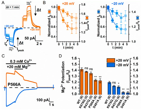 The results shown in Figure 2B and in Figure 3C,D,F reveal a significant variation in the degree of potentiation among different membrane patches even before the treatment with poly-l-lysine. TMEM16 currents are known to undergo significant rundown, and poly-l-lysine facilitates the rundown process, an effect attributed to a depletion of phospholipids [23,42]. We thus examined if the degree of the potentiation correlates with channel rundown. Figure 4A shows an experiment on a TMEM16A mutant, Y589A16A. Here, the Mg2+ potentiation was tested every one minute at +20 mV and −20 mV. The rundown of the TMEM16A current can be directly observed from the time-dependent reduction of I0 from the recording traces in Figure 4A and from the averaged I0 in Figure 4B (circles). Figure 4B also shows that the averaged degree of the Mg2+ potentiation (Ipeak/I0, squares) was reduced during the current rundown. We also tested if mutations that reduce the binding of phosphatidylinositol-(4,5)-biphosphate (PIP2) to TMEM16A [22,42] alter the degree of potentiation. Figure 4C,D confirm that the current potentiation by 20 mM [Mg2+]i is significantly smaller in P566A16A and D481A16A mutants than that in WT16A whether the effects were examined at +20 mV or −20 mV. On the other hand, the mutation effects of K678Q16A and R437Q16A appear to be less pronounced—the potentiation in these two mutants is more similar to that in WT16A. Only the potentiation at −20 mV in R437Q is significantly smaller than that in WT16A. We speculated that the variation of these mutation effects in different mutants might be related to the physical distance of the mutated residues from the pore (see Discussion).