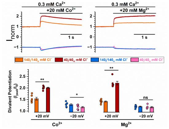 Enhanced divalent cation potentiation of WT16A in low ionic strength solutions. (Top) Recording traces comparing the Co2+ or Mg2+ potentiation of WT16A between conditions of symmetrical 140 mM and 40 mM NaCl. The 40 mM NaCl solution also contains 100 mM D-mannitol. All currents were induced by 0.3 mM [Ca2+]i. (Bottom) Bar graph summarizing Co2+ and Mg2+ potentiation under symmetrical 140 mM or 40 mM NaCl (n = 6–8). ns p > 0.05; * p < 0.05; ** p < 0.005 by one-way ANOVA followed by Bonferroni’s multiple comparisons.