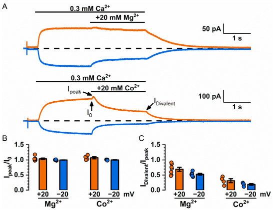The electrostatic control of channel conductance is thought to result from an increase in the local concentration of the counter-charged ions or a decrease in the concentration of the ions with the same charge near the pore [43,44,47]. Because TMEM16F conducts both cations and anions, we expected that the current potentiation in TMEM16F by divalent cations would be smaller than that in TMEM16A because TMEM16F conducts cations as well as anions. To study current potentiation in TMEM16F, we performed experiments on the Q559W mutant of TMEM16F (abbreviated as Q559W16F) due to the technical advantage of a slower current rundown in this mutant [34]. The recording traces shown in Figure 6A and the averaged data in Figure 6B indeed indicate that 20 mM Mg2+ or Co2+ generates very little current potentiation in Q559W16F. On the other hand, Mg2+ and Co2+ inhibit the Q559W16F current (Figure 6A,C), likely by competing with Ca2+ for the high-affinity activation sites as that shown in TMEM16A [26,38].