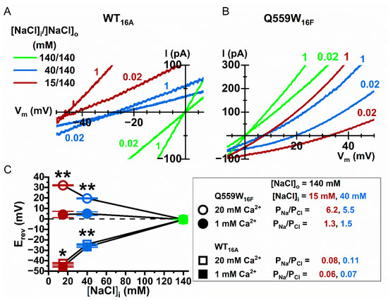 In measuring the PNa/PCl ratios of Q559W16F with asymmetric [NaCl], we noticed that the PNa/PCl ratio appears to be affected by [NaCl]i, especially in the experiments with low [Ca2+]i (20 µM). For example, with 15 mM [NaCl]i, the current induced by 20 µM [Ca2+]i has a PNa/PCl ratio of 6.2 ± 0.2, which is significantly larger than the PNa/PCl ratio of 5.5 ± 0.4 for the current induced by the same [Ca2+]i in 40 mM [NaCl]i (Table 1). Since the controversial PNa/PCl ratios from different laboratories were obtained with different intracellular concentrations of monovalent ions [10,31,32,33,34,35], we examined the effect of [NaCl]i on the PNa/PCl ratio more rigorously. In this experiment, we used a non-charged molecule, mannitol, to replace [NaCl]i, and systemically changed [NaCl]i in intracellular solutions containing 20 µM [Ca2+]i (Figure 10A). The PNa/PCl ratios of the Q559W16F current at 70 mM and 280 mM of [NaCl]i were reduced to 2.8 ± 0.3 and 1.7 ± 0.1, respectively, in the same 20 µM [Ca2+]i (Table 1). Figure 10B,C show that the ratio of PNa/PCl of Q559W16F reduced with an increase of [NaCl]i, suggesting a reduction of cation selectivity in high [NaCl]i. It should be emphasized that except for the indicated [NaCl]i the intracellular solutions in these experiments did not include other salts (mannitol was used to replace the reduced [NaCl]i). Although the affinities of phospholipid binding with monovalent cations are lower than those with divalent cations, the monovalent cation Na+ is likely the culprit, rendering the pore of Q559W16F less cation-selective.