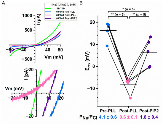 Effects of manipulating membrane phospholipids on the PNa/PCl ratio of Q559W16F. All experiments were performed with 20 µM [Ca2+]i. [NaCl]o = 140 mM in all experiments. (A) Representative I–V curves of Q559W16F in various intracellular solutions; −80 mV to +80 mV are shown in the top panel, whereas the expanded traces near reversal potentials are depicted at the bottom. Experiments were first performed in 140 mM [NaCl]i (green traces), followed by experiments in 40 mM [NaCl]i before (blue traces) and after (pink traces) 0.3 mg/mL intracellular poly-l-lysine treatment for 5 sec. Finally, the I–V curve was obtained after the patch was intracellularly treated with 20 µM PIP2 for 1 min (purple traces). (B) Altering the PNa/PCl ratio of Q559W16F after treating membrane patches with intracellular poly-l-lysine or PIP2. Results are from experiments like those shown in (A) and data points from the same patch are connected by line segments. Horizontal lines depict the averaged reversal potentials from individual data set. The mean PNa/PCl ratios (± SEM) at the bottom of the plot were calculated according to equation 1. * p < 0.05; ** p < 0.005 by one-way ANOVA followed by Bonferroni’s multiple comparisons.