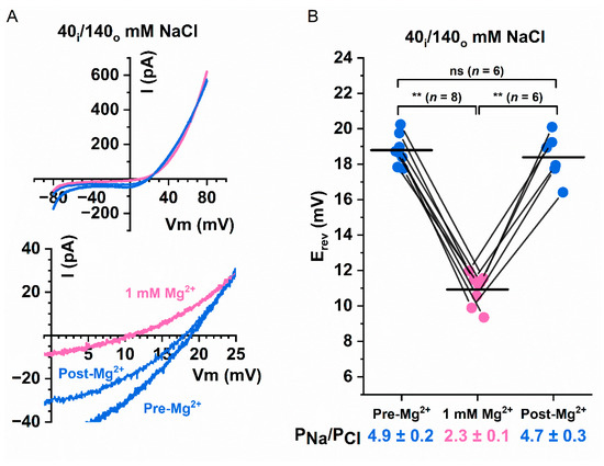 Effects of [Mg2+]i on the PNa/PCl ratio of Q559W16F. (A) Representative I–V curves of Q559W16F under asymmetrical [NaCl] in the presence and absence of 1 mM Mg2+. Currents were activated by 20 µM [Ca2+]i. Bottom panel shows the same I–V curves expanded around Erev. (B) Paired data showing the values of Erev in the presence (pink circles) of 1 mM Mg2+, and the values of Erev before Mg2+ wash-in and after Mg2+ wash-out (blue circles). Horizontal black lines indicate the mean value for each data set. Calculated PNa/PCl ratios are shown at the bottom of the plot. ns p > 0.05; ** p < 0.005 by one-way ANOVA followed by Bonferroni’s multiple comparisons.