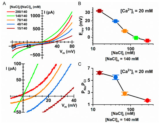 Monovalent ions appeared to modulate the ion selectivity of TMEM16 proteins as well, as shown by the dependence of the PNa/PCl ratio of Q559W16F on [NaCl]i (Figure 10 and Table 1). With [Ca2+]i = 20 µM, the PNa/PCl ratios of Q559W16F were ~5–6 in 15–40 mM [NaCl]i. When [NaCl]i was increased to 70–280 mM, the calculated PNa/PCl ratio was reduced to ~2. The binding affinities of phospholipids with monovalent cations have been shown to be lower than those with divalent cations and could be in the range of tens to hundreds of mM [39,41]. The observation that the PNa/PCl ratios at 15 and 40 mM [NaCl]i were more similar to each other than to those at 70 mM [NaCl]i is consistent with such a very low binding affinity between phospholipids and monovalent cations.