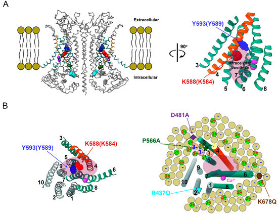 - Lam, A.K.M.; Dutzler, R. Calcium-dependent electrostatic control of anion access to the pore of the calcium-activated chloride channel TMEM16A. eLife 2018, 7, e39122. [Google Scholar] [CrossRef] [PubMed]