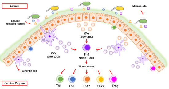 DCs are recognized as the main antigen-presenting cells in the gut lamina propria and can integrate signals from the intestinal lumen and shape appropriate immune responses. In addition to direct sampling of luminal microbes, DCs receive information from EVs released by other cell types and/or tissues under healthy and pathological conditions that include intestinal infections, inflammation, or cancer. IECs are key players in this indirect pathway of communication, since once activated by an external stimulus they transmit the information to the underlying immune cells by releasing EVs and soluble mediators (Figure 2). Then, activated DCs elicit suitable T-cell responses through antigen presentation and secretion of specific cytokines. In this context, activated DCs secrete EVs containing MHC class I and class II complexes and costimulatory molecules that contribute to antigen presentation and immunomodulatory effects towards CD4+ or CD8+ T cells.