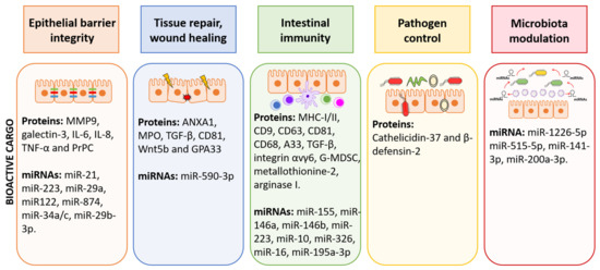 There is mounting evidence that intra- and interkingdom crosstalk is mediated by EVs released by gut microbiota or by host intestinal cells. This review is focused on host-derived EVs. It is well known that cargos in EVs confer specific properties and functions. For instance, the presence in EVs of metalloproteinases (MMPs), chemokines, cytokines, growth factors, adhesion molecules, and miRNAs plays a crucial role in processes involving the immune system. Differences in the amount of released EVs and their composition have been observed in health and disease states. High levels of EVs with different content were found in samples from patients with inflammatory bowel disease (IBD), which suggests their contribution to intestinal inflammatory processes [46]. The role of EVs as messengers in cell-to-cell communication inside the body is not limited to the gut environment. As mentioned above, it is now well accepted that circulating EVs can reflect diverse healthy and pathologic states of cells and tissues. Therefore, they are being explored as diagnostic biomarkers or therapy tools in several disorders.