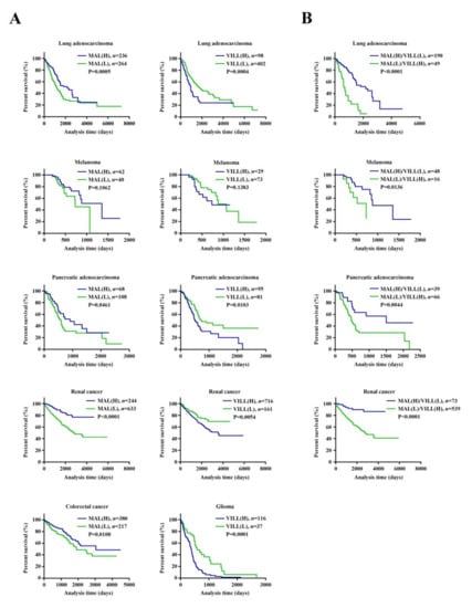 3.3. The Runx3-Altered Transcriptional Profile May Have Prognostic Value for Various Cancers, as Evidenced by MAL and/or VILL
