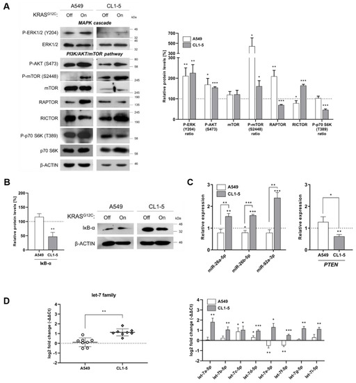 In addition, we looked for differences at the post-transcriptional level and we measured the expression of miR-26a-5p, miR-26b-5p and miR-92a-3p, which downregulate PTEN, a known tumor-suppressor and major regulator of the PI3K/AKT pathway [21]. We observed that KRASG12C induction upregulated the expression of all three miRNAs only in CL1-5 cells (Figure 2C). Moreover, we observed upregulation of all members of the tumor suppressor let-7 family, again only in CL1-5 cells (Figure 2D). The let-7 family of miRNAs targets major oncogenes, including KRAS and c-MYC, and upregulation of specific members of the let-7 family has been detected in senescent human lung fibroblasts [22,23]. Therefore, our observation suggests induction of a protective response against the oncogenic signal of KRASG12C in CL1-5 cells. Taken together, our results indicate that KRASG12C activates equally the MAPK pathway in both cell lines. In A549 cells, the PI3K/AKT signal is transduced possibly through the activation of the mTORC1 axis, which presumably leads to the stimulation of translation initiation. On the other hand, in CL1-5 cells the mTORC1/p70S6K is downregulated and, instead, the formation of mTORC2 complex is favored. The latter is currently considered a novel KRAS direct effector activator of NF-κB [14,24].