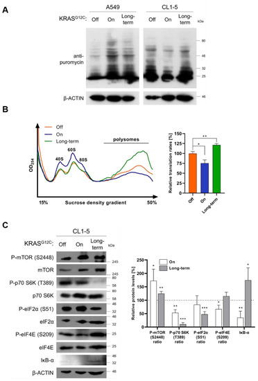 In conclusion, induction of KRASG12C in A549 cells targets translation initiation and leads cells to elevated global translation rates through activation of the mTORC1 axis. In CL1-5 cells, the short-term induction leads to impairment of cap-dependent translation and a possible switch to IRES-mediated protein synthesis. However, prolonged expression of KRASG12C leads to the promotion of translation rates in an mTORC1/p70S6K-independent mode, which is mediated mainly by the hypophosphorylation of eIF2α. Our results indicate that KRASG12C oncogenic signaling can differentially target translation initiation in different oncogenic contexts and provides details on the effects of KRASG12C signaling on translation initiation. Targeting the translation machinery in KRASG12C-driven lung adenocarcinomas could possibly improve the very promising ongoing attempts to specifically target KRASG12C.