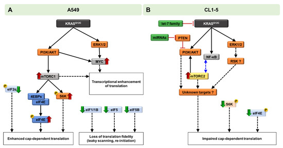 Schematic representation of the differential KRASG12C-mediated oncogenic signaling and modulation of translation. (A) In A549 cells, expression of KRASG12C mediates its oncogenic signaling through the MAPK and PI3K/AKT/mTORC1/p70S6K signaling pathways. Downstream targeting of 4E-BPs and eIF4E, along with the hypophosphorylation of the eIF2α subunit, leads to enhanced cap-dependent translation. Downregulation of eIF1, eIF5 and eIF5B is possibly associated with loss of translation fidelity during scanning of the mRNA, while recruitment of c-MYC, along with activated mTORC1, further promotes translation at the transcription level. All these events lead to promotion of translation and enhanced cell proliferation. (B) In CL1-5 cells, expression of KRASG12C leads to activation of both MAPK and PI3K/AKT signaling pathways. PI3K axis activation is further enhanced by targeting of tumor-suppressor PTEN by miRNAs, while the tumor-suppressor let-7 family of miRNAs is upregulated due to a possible stress response mechanism. Interestingly, mTORC2 formation is promoted and is possibly correlated with the activation of NF-κB. Downstream transcriptional and translational events, with participation of unidentified effectors, which could involve the ERK1/2-targeted RSK (Ribosomal S6 Kinase), along with the hypophosphorylation of both p70S6K and eIF4E, lead to impairment of cap-dependent translation.
