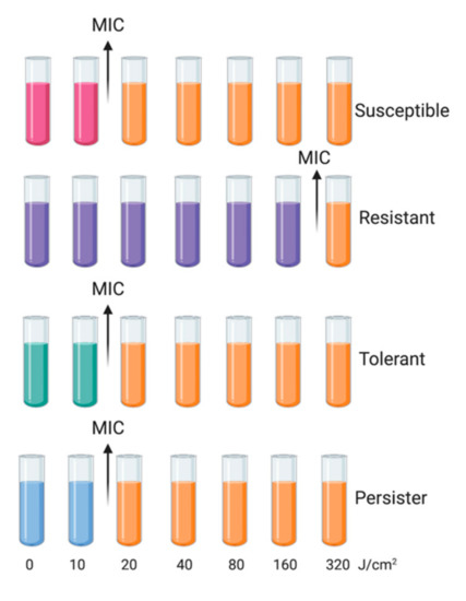 Minimum inhibitory concentration (MIC) characteristics of bacterial responses to light-based treatments. MIC values for bacterial strains resistant to light-based treatment are significantly higher than those for susceptible strains. Resistance is an acquired and inherited decline in the effectiveness of a given treatment (the need for higher concentrations of a photosensitizing agent); Tolerance is an acquired stable feature (the need for longer treatment duration to achieve the same killing efficacy regardless of the concentration of the photosensitizing agent); Persistence is a nonheritable and dormant phenotypic state (transient tolerance) represented by a small subpopulation (about 0.1–1%). Colored probes represent bacterial growth, and orange indicates growth inhibition due to phototreatment conditions leading to cell death. MIC values for strains expressing tolerance or persistence are similar to those of susceptible strains. Concentrations are chosen for illustration purposes only (modified from Brauner et al.).