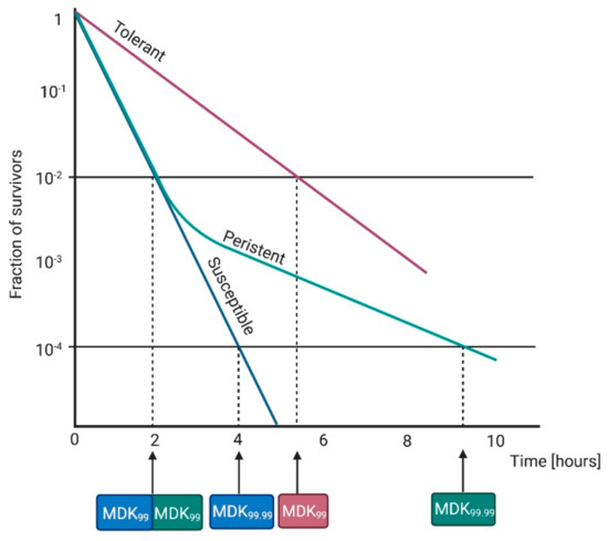 Moreover, the whole concept is further complicated by the phenomenon of persistence. The terms “resistance” and “tolerance” can be applied to whole microbial populations, while “persistence” is characteristic of a surviving subpopulation (ranging from 10−6 to 10−1) and mainly occurs when a majority of bacterial cells is instantly killed [10]. Furthermore, it is nonheritable, and persisters are genetically identical to their nontolerant kin, but with a transient main cellular process blockage [11]. Persisters have a slow or non-replicating growth rate due to forceful environmental stresses, e.g., oxidative stress or starvation [12,13,14,15,16]. Persisters have similar MIC and MDK99 values to susceptible cells, but higher MDK99,99 (Figure 2) [5].