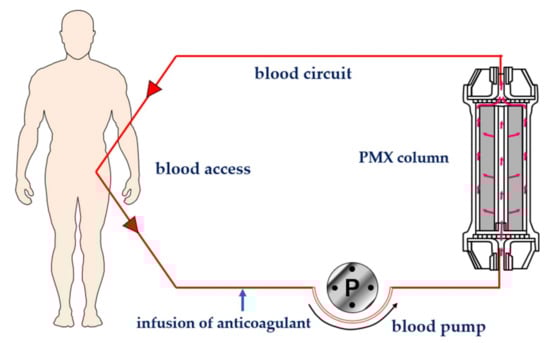 - Katagiri, D.; Ishikane, M.; Asai, Y.; Izumi, S.; Takasaki, J.; Katsuoka, H.; Kondo, I.; Ide, S.; Nakamura, K.; Nakamoto, T.; et al. Direct hemoperfusion using a polymyxin B-immobilized polystyrene column for COVID-19. J. Clin. Apher. 2020, 1–9. [Google Scholar] [CrossRef]