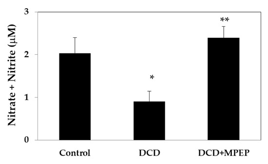 MPEP treatment increases nitrate plus nitrite (NOx) levels in DCD livers during cold storage (22 h in UW solution). Control animals underwent cold storage; in the DCD group, the livers, after 30 min warm ischemia, were submitted to cold storage. In the DCD-MPEP group, the drug (10 mg/Kg) was administered 30 min before the portal clamping and added to the UW-solution (3 µM). The results are reported as the mean ±SE. * p < 0.05 versus control; ** p < 0.05 versus DCD.