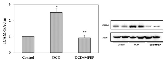 MPEP treatment decreases ICAM-1 in DCD livers during cold storage (22 h in UW solution). Control animals underwent cold storage; in the DCD group, the livers, after 30 min warm ischemia, were submitted to cold storage. In the DCD-MPEP group, the drug (10 mg/Kg) was administered 30 min before the portal clamping and added to the UW solution (3 µM). The results are reported as the mean ± SE. * p < 0.05 versus control; ** p < 0.05 versus DCD.