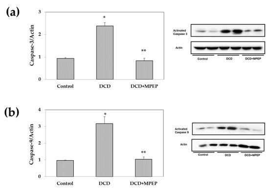 MPEP treatment decreases apoptosis in DCD livers during cold storage. (a) Caspase-3 and (b) Caspase-9 were determined in livers stored for 22 h in UW solution. Control animals underwent cold storage; in the DCD group, the livers, after 30 min warm ischemia, were submitted to cold storage. In the DCD-MPEP group, the drug (10 mg/Kg) was administered 30 min before the portal clamping and added to the UW solution (3 µM). The results are reported as the mean ±SE. * p < 0.05 versus control; ** p < 0.05 versus DCD.