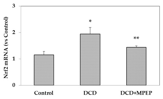 Nrf2 plays a crucial role as a key oxidative-stress-sensitive gene. Therefore, the present study investigated whether MPEP conferred protection against cold storage in livers obtained from DCD rat via alterations in Nrf2 expression. The results showed that at the end of preservation, an increase in Nrf2 expression in the DCD group compared with the control group occurred; Nrf2 levels were recovered in MPEP-treated DCD group (Figure 5).