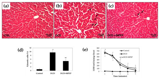 Representative photomicrographs of the morphology (hematoxylin and eosin staining) of DCD livers after cold storage (22 h in UW solution). (a) Control animals underwent cold storage; (b) in the DCD group, the livers, after 30 min warm ischemia, were submitted to cold storage. (c) In the DCD-MPEP group, the drug (10 mg/Kg) was administered 30 min before the portal clamping and added to the UW solution (3 µM). (d) Pyknotic cells at the end of cold storage. (e) LDH release during washout. Arrows: pyknotic nuclei; scale bar: 50 μm. The results are reported as the mean ±SE. * p < 0.05 versus control; ** p < 0.05 versus DCD.