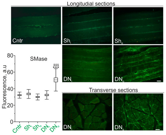 SMase is upregulated in denervated rat soleus muscle. Expression of immunoreactive SMase in sections of soleus muscle fibers of the control (Cntr), unilaterally sham-operated (Sh) and unilaterally denervated (DN) rats. Shi and Sho—muscles from the intact and sham-operated limb; DNi and DNo—muscles from the intact and denervated limb. Shown longitudinal (Cntr, Sh, DN) and transverse (DN) sections. Scale bars—10 μm. Left: quantification of fluorescence (mean; box range—SEM; whiskers—SD); N = 6 animals for each group. *** p < 0.001—in comparison to the intact limb; &&& p < 0.001 in comparison to the sham-operated control. p was evaluated by a two-way ANOVA followed by Bonferroni post hoc test.