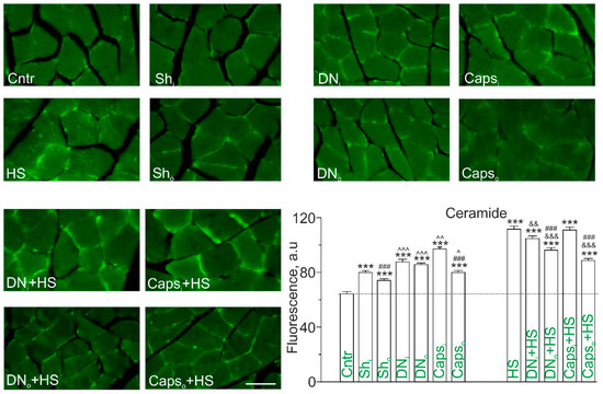 Consistent with our previous data [14], HS was accompanied by the substantial increase in Cer staining in both the plasma membrane and intracellular compartments of muscle fibers (Figure 2). The magnitude of HS-evoked increment of Cer content was higher than observed in case of denervation or treatment with Caps. Surprisingly, both denervation and Caps treatment visibly attenuated the effects of HS in the soleus muscles from both operated (more markedly) and intact limb. Indeed, the effect was more intensely expressed in the denervated muscle (−13.8% in comparison with HS, p < 0.001); in the intact muscle Cer was decreased only by 6 % in comparison with HS (p < 0.01). Caps treatment decreased Cer immunoexpression in ipsilateral muscle (−16.2% vs. HS, p < 0.001) (Figure 2).