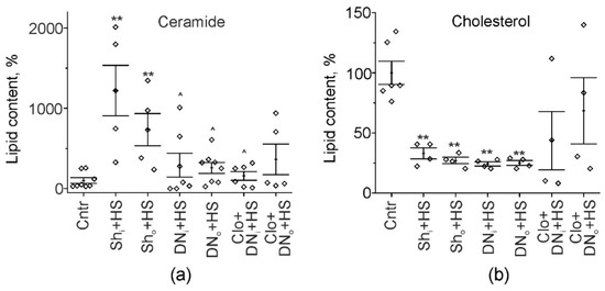 Cer and Chol amount in soleus muscle homogenates. (a,b) Quantifications of Cer and Chol content (in %). Shown data for control (Cntr), sham-operated suspended (Sh+HS), unilaterally denervated suspended (DN+HS) and clomipramine-pretreated unilaterally denervated suspended (Clo+DN+HS) rats. Shi and Sho—muscles from the intact and sham-operated limb; DNi and DNo—muscles from the intact and denervated limb. Data are represented as mean ± SEM; diamonds are individual values; N = 5–8 per group. ** p< 0.01, —differences compared to control (Cntr); ^ p < 0.05—differences compared to HS sham operated animals. p was evaluated by Kruskal–Wallis and Mann–Whitney tests.