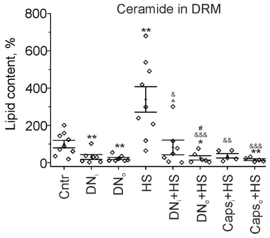 Cer content in DRM fraction. Cer levels in control (Cntr), after unilateral denervation (DN)/Caps treatment (Caps) itself and in combination with HS are shown. Data are represented as mean ± SEM; diamonds are individual values; N = 5−9 per group. * p< 0.05, ** p< 0.01—differences compared to control; & p< 0.05, && p< 0.01, &&& p< 0.001—differences compared to HS; # p < 0.05—differences between intact and operated limb, ^—differences between HS and HS+DNi. p was evaluated by a Kruskal–Wallis and Mann–Whitney tests. DNi, Capsi and DNo, Capso—intact and operated limb, respectively.