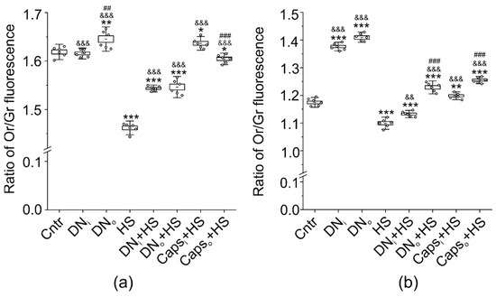 Remarkably, the application of Caps [28,49] to the sciatic nerve completely or mostly prevented the HS-mediated reduction of Or/Gr ratio in the junctional region of muscles from the intact or operated limb, respectively (Figure 6a). In muscle fiber membranes (extrajunctional region), changes in F2N12S fluorescence had similar directions (Figure 6b). The denervation significantly increased the Or/Gr ratio in extrajunctional regions of both intact (by+17.2 ± 0.4%) and denervated (by+19.7 ± 0.4%) muscle. In addition, the HS-induced decrease in Or/Gr ratio in extrajunctional region was reduced in intact and prevented in denervated muscle. Finally, Caps application on the sciatic nerve abolished the decrease in Or/Gr ratio in response to HS in intact and operated muscle (Figure 6b). Hence, short-term denervation can increase a membrane asymmetry and (or) ordering in both intact and denervated muscle. This effect is especially pronounced in the extrajunctional region of both intact and denervated muscles, suggesting the systemic response and high sensitivity of the extrajunctional membrane to “trophic” influence deriving from the innervation. Furthermore, the denervation suppressed the HS-induced membrane disturbance in junctional and extrajunctional regions. One of the possible mechanisms by which denervation can elicit the systemic reaction is a cessation of afferent nerve activity. Consistent with this assumption, the unilateral blockage of Caps-sensitive afferents in sciatic nerve prevented the loss of membrane asymmetry (ordering) in response to HS. Furthermore, the effect of Caps on the HS-induced sarcolemmal alterations was expressed more intensely than that of the denervation.