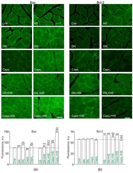 Loss of lipid raft integrity, lipid ordering and asymmetry as well as Cer accumulation can decrease cell viability, leading to destructive alterations in muscle fibers. To assess such changes, immunoexpression of apoptotic-related proteins, proapoptotic Bax (Figure 7a) and protective Bcl-2 (Figure 7b), was evaluated. Bax immunofluorescence was slightly enhanced on transverse sections of both denervated (DNo;+18.1%) and nondenervated (DNi; +7.0%) soleus muscle. Unilateral Caps application on the sciatic nerve decreased the Bax fluorescence in the intact muscle (−10.1%), but increased it in the operated muscle (+13.3%). The difference between intact and operated limbs was significant for both denervation and Caps treatment (Figure 7a). Interestingly, HS did not modify the fluorescent signal from Bax. Furthermore, HS had no marked effect on denervation-induced slight enhancement of Bax fluorescence, but markedly augmented Caps-mediated increase in Bax levels in the operated limb (in these conditions, Bax signal increased by +93.5% vs. control). Additionally, Caps increased Bax immunoexpression in the intact muscle (+29.1% vs. control).