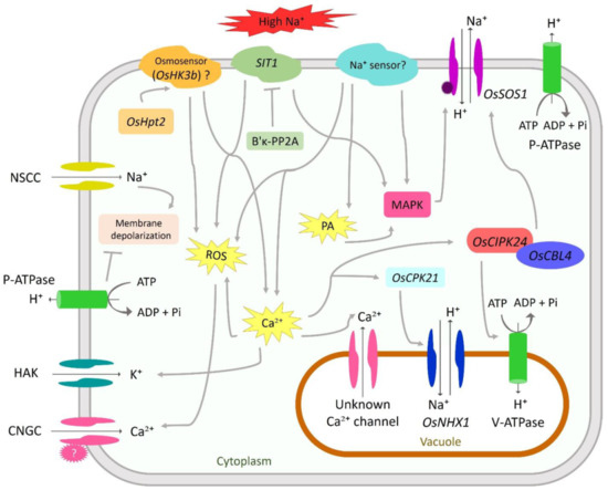 Salt sensing and signaling involved in rice responses to salt stress. Under high salinity, salt-induced osmotic stress begins, which is sensed by putative osmosensor OsHK3b, activated by OsHpt2. SIT1 also acts as a sensor via elevated kinase activity and induces reactive oxygen species (ROS) production and mitogen-activated protein kinase (MAPK) signaling. The activity of SIT1 is deactivated by the B’κ-PP2A subunit. Later, ionic stress occurs and is sensed by an unknown Na+ sensor. The Na+ enters the mature epidermal cell through nonselective cation channel (NSCC), causing membrane depolarization, and is polarized by P-type ATPases. Excess salt triggers a spike in the concentration of cytosolic secondary messengers, including Ca2+, reactive oxygen species (ROS), and phosphatidic acid (PA). ROS triggers Ca2+ influx through the cyclic nucleotide-gated ion channel (CNGC), activated by an unknown molecule. Ca2+ not only decreases K+ efflux but also induces further ROS accumulation; thus, a positive feedback loop exists between Ca2+ and ROS. The cytosolic Ca2+ also induces vacuolar Ca2+ release and activates Ca2+-binding proteins, such as OsCIPK24-OsCBL4 complex. This complex, together with MAPK, activated by phosphatidic acid, upregulates the OsSOS1 to remove cytosolic Na+. The vacuolar OsNHX1 gene is activated by OsCPK21, whereas the V-type ATPase is activated by OsCIPK24, establishing a proton gradient and driving the activity of OsNHX1.