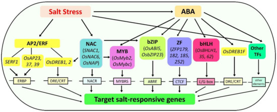 TFs are key proteins that bind with cis-elements in the promoter of target genes, thereby modulating the rate of gene expression in the downstream signaling cascades in response to different environmental cues. A large number of TFs have been identified in rice, with 2025 TFs in Oryza sativa spp. indica and 2384 in spp. japonica [137]. In recent years, many TFs along with their interacting proteins have been implicated in rice responses to salt stress and regulate a series of signaling pathways (Table 1). Most of these are members of APETALA2/ethylene responsive-factor (AP2/ERF), NAC (NAM, ATAF, and CUC) proteins, myeloblastosis (MYB), basic leucine-zipper (bZIP) type proteins, zinc finger (ZF) and basic helix-loop-helix (bHLH) TFs that regulate many salt stress-responsive genes either through an ABA-dependent or -independent manner (Figure 2). Thus, understanding how TFs, along with their interacting proteins, regulate a network of signaling pathways and their downstream genes is crucial in elucidating the salt tolerance mechanisms of rice.