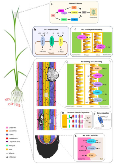 Several adaptive mechanisms have been observed in plant responses to salt stress. In rice, osmoregulation, stomatal closure, and development of antioxidant enzymes are the immediate responses during salt stress. This is later followed by Na+ exclusion and sequestration upon uptake of toxic Na+ ions. The tissue specific localization of genes that regulate salt tolerance adaptive traits in rice is presented in Figure 3.