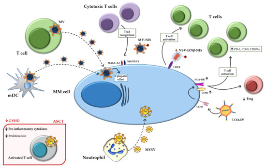 Recently, MV has been used as an immunotherapeutic agent to generate a persistent antitumor immune stimulation in MM patients [21]. In particular, a study by Packiriswamy et al. investigated primary T cell responses against a known panel of tumor-associated antigens (TAAs) in MM, after administration of oncolytic MV encoding sodium iodide symporter (MV-NIS) [78]. The T cell responses against the analyzed TAAs, specifically melanoma antigen gene (MAGE)-C1 and MAGE-A3, were increased after the MV-NIS treatment. Only one patient achieved complete remission with an advanced anticancer T-cell response. Another patient had mild focal relapses few months after oncolytic MV-NIS treatment, which were treated and resolved. The authors suggest that virotherapy could have potentiated the T-cell antitumor response, which was further improved after local radiotherapy treatment. Interestingly, MM patients treated with MV-NIS showed a significant increase in post-virotherapy CD3+ T lymphocytes, and this was largely due to an increase in CD8+ T cells; no changes were observed either in CD4+ T cells or in Tregs. Additionally, a more detailed analysis of the lymphocyte population showed an increased percentage of effector memory and central memory CD8+ after MV-NIS treatment, suggesting that virotherapy induced the activation of T lymphocytes.