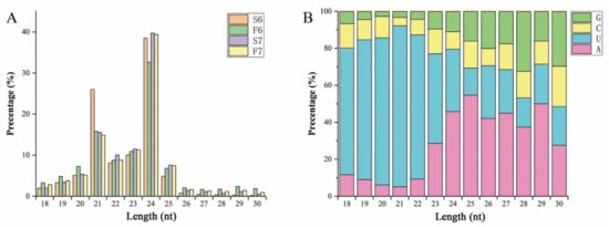Lengths of small RNAs (sRNAs) and first bases of mature microRNAs (miRNAs) in sequencing libraries. (A) Size distribution of sRNA sequences identified in the sequencing libraries. The X-axis represents sRNAs of different lengths, while the Y-axis displays the number of sRNAs of a certain length. (B) The first base preference of mature miRNAs in the sequencing libraries. The X-axis represents the length classification of the sRNAs, and the Y-axis displays the proportion of mature miRNAs with a certain base type as the first base.