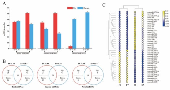 Differentially expressed miRNAs in PA64S(S) and PA64S(F). (A) The number of miRNAs up- or downregulated in stages 6 and 7. (p < 0.05) (B) Venn diagrams showing the unique and shared differentially expressed miRNAs in stages 6 and 7. (C) Hierarchical cluster analysis of 39 differentially expressed miRNAs in stages 6 and 7. The relative expression levels in the figure are the average of three replications.