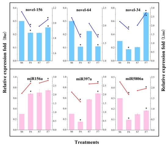 To verify the accuracy of the miRNA sequencing data, six differentially expressed miRNAs were randomly selected for qPCR analysis (Figure 4). Three known miRNAs and three novel miRNAs were randomly selected from the anthers of PA64S(S) and PA64S(F), and their expression was determined in stages 6 and 7. Novel-64 showed a higher expression in sterile plants than fertile plants in both stages 6 and 7, whereas the known miR156a showed a higher expression in fertile plants than in sterile plants in both periods. The expression trends of each miRNA measured by qPCR were consistent with the expression trends of sRNA sequencing results, indicating that the sRNA sequencing results were reliable.