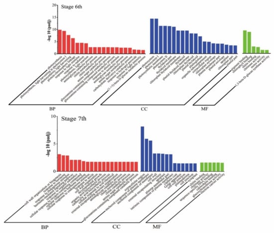 The Gene Ontology (GO) analysis of DEGs was performed, and DEGs were classified into three major categories: biological processes, cellular components, and molecular function (Figure 6). At stages 6, 24, 33 and 6 GO terms were significantly enriched in biological processes, cellular components, and molecular function, respectively. At stages 7, 34, 14 and 6, GO terms were significantly enriched in biological processes, cellular components, and molecular function, respectively. Biological processes associated with “photosynthesis” and “photosynthesis light reaction” were significantly enriched in stages 6, and in 7, the main biological processes were enriched in “response to hormone”, “hormone-mediated signaling pathway”, and “cellular response to hormone stimulus”. Among the cellular components, “photosystem”, “photosynthetic membrane”, and “thylakoid part” were particularly prominent in stage 6, while the “extracellular region” and “component of plasma membrane” were prominently enriched in stage 7. Among molecular functions, both periods were prominent in “chlorophyll binding” and “chitin binding”.