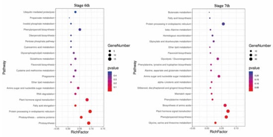 Kyoto Encyclopedia of Genes and Genomes (KEGG) enrichment analysis of DEGs in stages 6 and 7. The top 20 enriched pathways in stages 6 and 7 are shown. Each circle represents a KEGG pathway. The X-axis represents the enrichment factor, which compares the ratio of genes annotated to a pathway among the DEGs to the ratio of genes annotated to that pathway among all genes, and the Y-axis represents the pathway name.