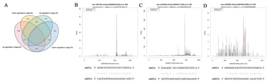 We identified 196 miRNAs in two stages, 166 (84.7%) of which were known miRNAs and 30 of which were novel miRNAs (Table S3). Of the 196 miRNAs, 53 miRNAs in stage 6 and 103 miRNAs in stage 7 were considered to be differentially expressed miRNAs in response to temperature variations (Figure 3A). Compared with PA64S(F) and PA64S(s), 107 miRNAs (including 46 of stage 6 and 61 of stage 7) were upregulated, and 89 miRNAs (including 47 of stage 6 and 42 of stage 7) were downregulated. The analysis of differentially expressed miRNAs in stages 6 and 7 revealed that 39 miRNAs exhibited a response to temperature changes in both stages, including 29 known miRNAs and 10 novel miRNAs (Figure 3B). Figure 3C shows the expression profiles of miRNAs that responded to temperature variations at two stages. Among these 39 miRNAs, 21 miRNAs showed an upregulated expression in S6, and 18 miRNAs showed a downregulated expression in S6; however, most of the miRNAs responding to the temperature change in stage 7 were downregulated. The secondary structure of the novel miRNAs was shown in Supplementary File 1.